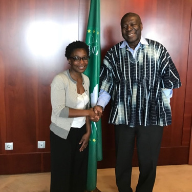 African Union (AU) Commission Vice Chairman H.E. Ambassador Kwesi Quartey, of Ghana, and SsahiPath Vice President & Chief Medical Officer Dr. Rebecca Obeng smile and shake hands for news photographers after meeting at the AU Headquarters in Addis Ababa, Ethiopia.